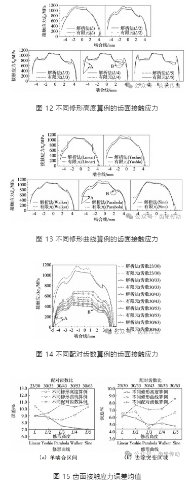 (2) 與此同時,在修形齒輪剛開始進入嚙合、即將退出嚙合以及修形曲線與漸開線過渡區域,有限元結果產生了局部應力突變,以圖 12 ~ 圖 14 中的 A、B 區域為例,主要由以下兩個原因導致: ①剛開始嚙入與即將退出嚙合時,接觸齒對嚙合力較小,需要極小網格尺寸( 低于微米 1 ~2 個量級) 才能有效捕捉到該處的接觸應力信息,建模困難,且嚙入時齒頂部位存在幾何尖點; ②修形齒廓過渡區域對幾何曲率產生一定程度的嚙合畸變。因此,當求解步長位于上述位置附近時會直接影響有限元計算結果,導致有限元局部應力突變、計算誤差較大,這是不可避免的。除去由有限元結果突變區域所帶來的計算誤差后,解析算法的齒面接觸應力在一個嚙合區間內的誤差均值(圖 15b) 變化范圍分別為 4.8% ~ 6.4% 、4.5% ~ 6.8% 、6.1% ~ 8.6% ,再次表明解析算法具有較高的齒面接觸應力計算精度與誤差穩定性。
