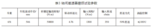 3)在中橋做效率臺架試驗時發現,由于阻力的作用中橋輸入轉速與貫通軸轉速始終存在微小差異,說明軸間差速器始終處于工作狀態。在實車運行過程中,即便平直道路行駛可能軸差、輪差也始終處于微動磨損運動中,尤其某個輪胎出現磨損不均勻滾動半徑不一致時或顛簸路況時。這種常規磨損工況當前標準已經能夠充分驗證。