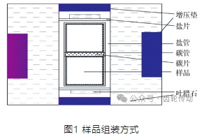 實(shí)驗(yàn)為提高合成壓力,對(duì)組裝結(jié)構(gòu)進(jìn)行了改進(jìn),在充分考慮高壓合成安全性和穩(wěn)定性的條件下,在原有組裝結(jié)構(gòu)6個(gè)面添加增壓塊,并通過(guò)調(diào)整錘壓的方式提高了合成塊的燒結(jié)壓力。實(shí)驗(yàn)時(shí)采用間接加熱方式,依靠腔體內(nèi)部的石墨發(fā)熱體加熱 CBN 粉末,并在腔體內(nèi)采用氧化鋯保溫材料,以加強(qiáng)高壓燒結(jié)系統(tǒng)的安全性和腔體燒結(jié)溫度的均勻性。實(shí)驗(yàn)過(guò)程中,利用Bi、Ba、Ti金屬絲的高壓相變 點(diǎn)標(biāo)定腔體內(nèi)部的實(shí)際壓力。高壓腔體壓力分4個(gè)梯度,分別為 5.5、6、6.5、7 GPa,不同的實(shí)驗(yàn)條件下只調(diào)整最高壓力值,升壓段和降壓段保持一致;保溫時(shí)間為 700 s,溫度為 1 500 ℃。圖 1 為樣品組裝方式。燒結(jié)塊是由增壓墊、樣品、鹽管、碳片、碳管和葉臘石塊等一起組成的實(shí)心塊體。葉臘石是層狀結(jié)構(gòu),在高壓下有良好的傳壓效果。鹽管的作用是為了使高溫下熔融鹽起到均衡壓力的作用,使原料粉體盡量接近等靜壓的狀態(tài)。增壓墊的作用是為了進(jìn)一步提升內(nèi)部壓力。同時(shí)利用碳片、碳管等的導(dǎo)電性能對(duì)組裝塊進(jìn)行加熱燒結(jié),最終合成出 PCBN材料。