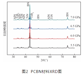 反應(yīng)過(guò)程中合成的 TiN,AlN 和 TiB2具有非常優(yōu)良的力學(xué)性能,如高硬度、耐磨損性、高導(dǎo)熱率和較低的熱膨脹系數(shù)等,其與 CBN 的匹配度也很好,非常適合作為PCBN的結(jié)合劑。綜上所述實(shí)驗(yàn)合成的 PCBN 材料兼具韌性好,熱穩(wěn)定性高,硬度高,導(dǎo)電性好等優(yōu)勢(shì),具有良好的綜合性能。由XRD圖可知,不同合成壓力下 PCBN 材料的物相無(wú)明顯差別,表明當(dāng)壓力達(dá)到 5.5 GPa 時(shí),就能合成 PCBN 材料。隨著合成壓力的提升,位于42.7°左右的TiN和 44.4°左右的TiB2的衍射峰強(qiáng)度均有不同程度升高,表明提高合成壓力可以起到增強(qiáng)復(fù)合材料結(jié)晶度的作用,有利于材料力學(xué)性能的提升。