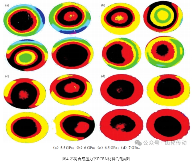 由圖4可知,隨著壓力的增加,樣品中的顏色偏差越來(lái)越少,厚度分布逐漸變得均勻,平整度越變?cè)胶谩_@可能是在較高的合成壓力下整個(gè)高壓腔體內(nèi)部趨于等壓狀態(tài),從四周到中心的壓力梯度減小所致。這表明,提高合成壓力有助于提高 PCBN 材料中CBN層的平整度。