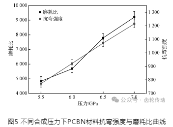 (1)在 7 GPa壓力下,合成的 PCBN樣品的抗彎強(qiáng)度和磨耗比最佳,分別為1 214.1 MPa和9 200。