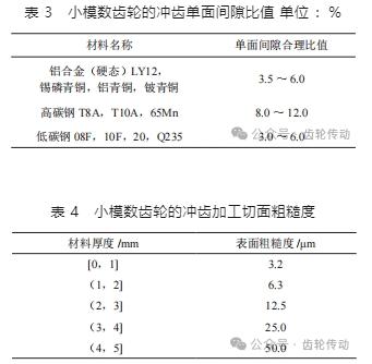作為壓力加工的工藝技術,小模數齒輪的沖齒加工是指常溫狀態下,在沖床上利用模具對板料施加壓力后致使模具與工件分開,從而得到所需的齒輪。這種加工工藝操作簡單,可實現自動化與機械化生產,工件尺寸掌握程度較高,能夠保持較高的一致性,適合批量化齒輪生產,但模具造價高,使用過程中需注意控制壓力。此外,沖齒加工由于受到加工材料的影響,沖齒的間隙和表面粗糙程度有所不同,如表 3 和表 4 所示。
