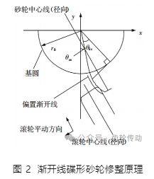 砂輪漸開線部分具有外凸的形狀,可采用帶有半徑為 R 的圓角的金剛滾輪進行修整,修整時機床運動軌跡為與砂輪截面漸開線法向偏置距離為 R 的偏置曲線,如圖 2 所示。圖示偏置漸開線方程為: