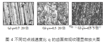 對不同線速度比得到的面齒輪齒面進行微觀觀測,如圖 4 所示,可以發現順修時面齒輪齒面上的耕犁痕跡較為明顯,這是因為順修時擠壓起占主導作用,獲得的砂輪磨粒較為鋒利;而逆修時面齒輪齒面上的耕犁痕跡難以辨認,這是因為逆修時相對運動速度較高,切削起主導作用,獲得的砂輪磨粒較為平整。