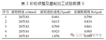 滾輪進給速度 f 定義為:砂輪每轉一轉滾輪在砂輪截面上沿機床軌跡前進的距離。滾輪的切削刃在砂輪上的運動軌跡在微觀上呈螺旋狀。試驗數據,如表 3 所示。其中,砂輪頂端的切點線速度比 q 均為 0.5,單次進給切深 ap 均為 0.02mm。