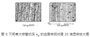 對不同單次修整切深 ap 得到的面齒輪齒面進行微觀觀測,如圖 8 所示。可以發現 ap 較大時面齒輪上耕犁痕跡較寬且深,而 ap 較小時面齒輪上耕犁痕跡較窄且淺,這是因為 ap 越大,修整力越大,修磨后的磨粒突出結合劑的高度也越大。