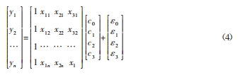 令 y=lnRa ,c0 =lnk,x1 =ln(0.9-q),x2 =lnf,x3 =lnap ,則模型可化為: