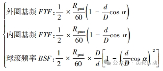 以上是齒輪箱的一些常見故障機理,這些故障會導致齒輪箱的振動、噪聲和溫度異常,嚴重時會造成機組故障和停機。在實際的齒輪箱故障分析中, 振動頻譜包含的信息很多,不同的齒輪故障頻率表現出不同的振動特征。因此,高效、準確診斷和及時處理齒輪箱故障對于確保風能發電機組的可靠性和運行效率顯得非常重要。軸承的故障特征頻率 (嚙合頻率)計算公式如下 :