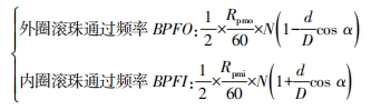 式中:Rpmi 和 Rpmo 分別為軸內圈、外圈轉速,N 為滾動體個數,D 為軸承節圓直徑,d 為滾動體直徑,α 為接觸角。