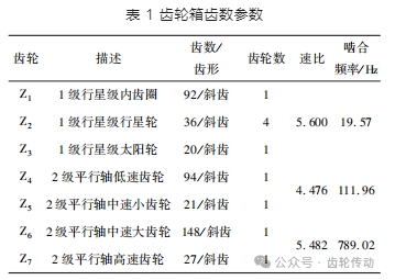 某風電場一臺結構為一級行星兩級平行風電機組齒輪箱,運行時間三年,振動分析工程師通過振動數據分析發現齒輪箱低速軸齒輪存在損傷。齒輪箱齒數參數如表 1 所示。