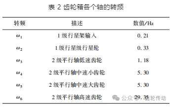 振動監測分析:實例所用齒輪箱的傳動比為 137. 47,在齒輪箱輸出轉速為 1 761 r/ min 工況下, 輸入轉速約為 12. 81 r/ min。齒輪箱輸入轉速為 12. 81 r/ min 時, 對齒輪箱輸出低速軸轉速為 71. 76 r/ min,齒輪箱各個軸的轉頻如表 2 所示。