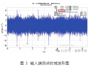 齒輪箱輸出轉速為 1 761 r/ min 時,使用在線振動監測系統可快速對 3 個測點所采集到的齒輪箱振動加速度信號作時域分析,發現輸入端徑向水平測點的振動加速度信號的時域波形存在明顯沖擊。后續僅對齒輪箱輸出低速軸測點做時域波形圖分析, 其波形如圖 3 所示。