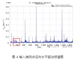 齒輪箱輸出低速軸徑向頻譜圖如圖 4 所示,2 級嚙合頻率及其倍頻明顯,嚙合頻率附近等間隔頻率線豐富,見 200 Hz 附近譜峰群底噪明顯升高。