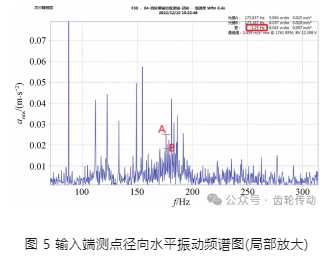從圖 5 可以看出,放大 200 Hz 譜峰群后,明顯可見存在等間隔邊帶線頻率,對間隔邊帶線頻率進行標注計算,通過在系統上對頻譜進行標記,即光標 A 和光標 B,可以在頻譜圖右上角讀出兩光標的間隔頻率為 1. 25 Hz,接近表 2 中的 2 級別平行低速齒輪轉頻 1. 18Hz。綜上分析可知,齒輪箱低速軸低速齒輪存在損傷。