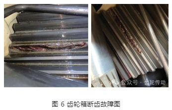 作者指導現場運維人員登塔開箱目視檢查發現,該風電機組齒輪箱低速軸大齒存在兩處斷裂情況,如圖 6 所示。經過運維人員精準維修和更換低速大齒后,該機組恢復正常運行。可見,基于在線振動監測技術的風電機組齒輪箱故障診斷方法具有較高的實用性和可行性,對于提高風電機組的可靠性和穩定性具有重要意義。