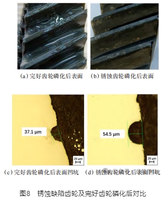 (3)引起失效的凹坑為齒輪熱后加工發送至磷化供應商處時,在流轉過程中齒輪銹蝕導致。該銹蝕凹坑同正常磷化凹坑形貌及尺寸均不同。