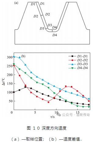 在加熱深度方向,生熱情況將反向影響加熱結(jié)果,齒輪內(nèi)部對應(yīng)位置與表面溫度的差值是最直接的體現(xiàn).圖 10 為深度方向溫度圖,如圖 10a 所示分別在齒頂、齒中、齒根以及齒底位置取分析節(jié)點,計算表面與內(nèi)部溫度差,取樣深度為 3 mm.D1 - D1、D2 - D2、D3 - D3 及 D4 - D4 位置的溫度差值隨時間變化如圖 10b 所示.其中,起始時間為截面出現(xiàn) 870 ℃高溫區(qū)域時。