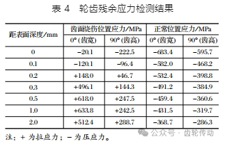 采用 XStress3000 型 X 射線應力分析儀對齒輪裂紋處和裂紋附近表面及內部進行殘余應力檢測,其檢測結果如表 4 所列。由表 4 可以看出,磨削燒傷位置表面壓應力較正常位置顯著減小,且隨著距表面深度的增加,滲層內的殘余應力變成拉應力并逐漸增加。