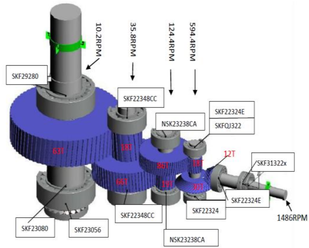 低速重載齒輪箱通常齒輪級數(shù)多、軸承多,運行過程中可能會產(chǎn)生各級齒輪嚙合頻率、各軸承故障特征頻率、各轉(zhuǎn)軸的轉(zhuǎn)動頻率等等,頻率成分較復雜,而在這些頻率中,高速軸齒輪缺陷嚙合產(chǎn)生的沖擊能量通常較大,產(chǎn)生的幅值較大的振動;而低速軸軸承、齒輪缺陷產(chǎn)生的沖擊能量往往較小,產(chǎn)生幅值較小的振動,這就往往容易被忽視而造成漏判。