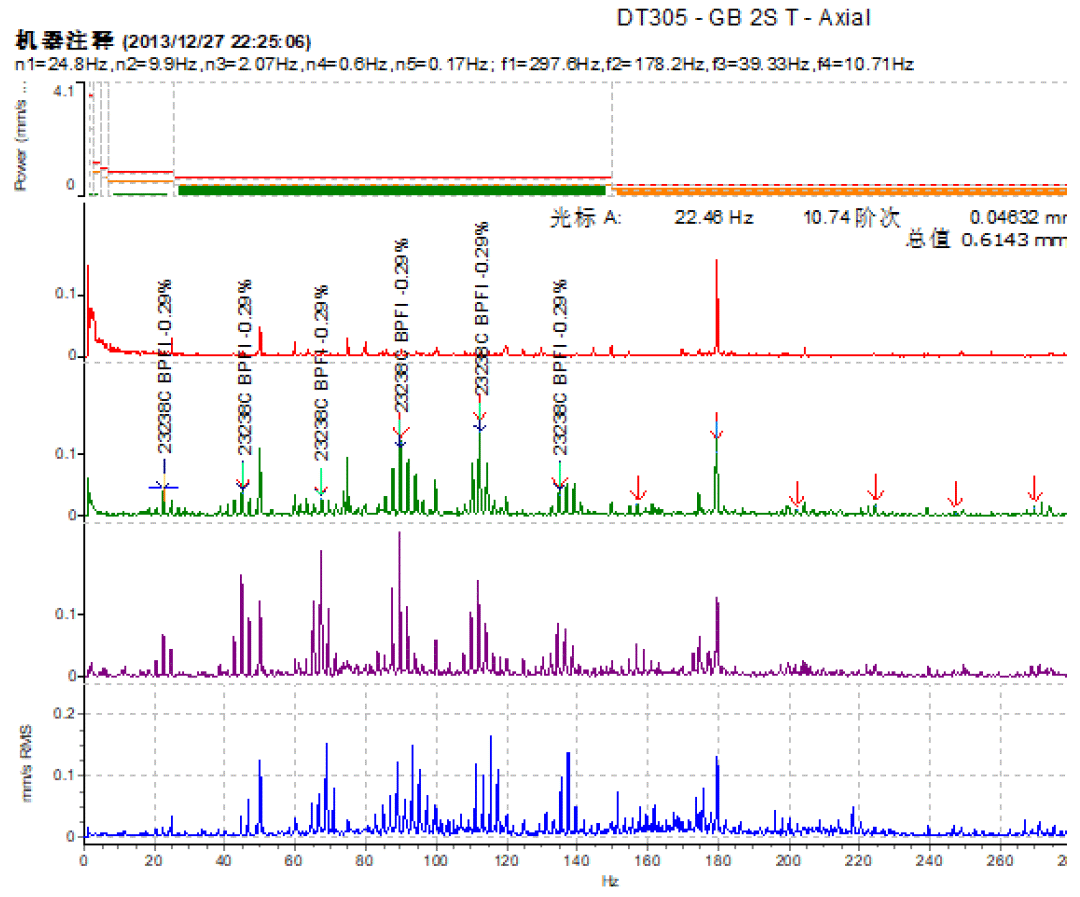 2014 年 5 月 15 日進行第二次振動檢測,檢測發(fā)現(xiàn),齒輪箱的狀態(tài)與上次檢測時相比發(fā)生了明顯的變化,經(jīng)分析,得到的結(jié)論是齒輪箱 GB 2S 軸上部軸承和 GB 3S 軸上部軸承出現(xiàn)了明顯故障,軸承內(nèi)圈出現(xiàn)嚴重磨損現(xiàn)象,需計劃安排更換軸承。