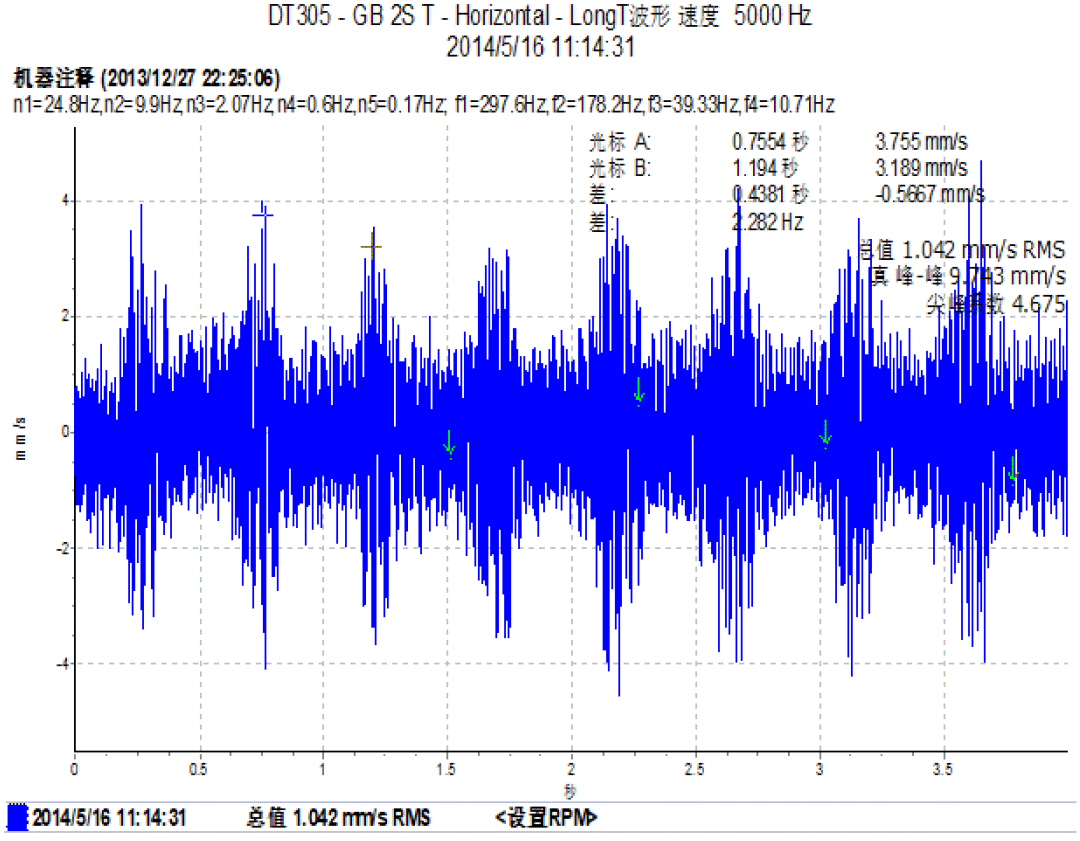測量參數(shù)的選擇對故障的發(fā)現(xiàn)尤為重要。本文所采用的是振動速度通頻振動和加速度長時間波形相結(jié)合。