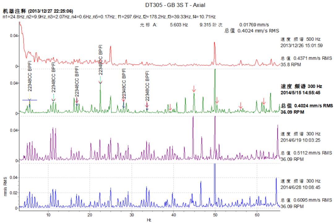 2013 年 12 月 26 日對該臺設(shè)備包括電機和減速機進行了第一次振動檢測,經(jīng)過分析,存在的問題除了聯(lián)軸器對中不良外,其他正常。