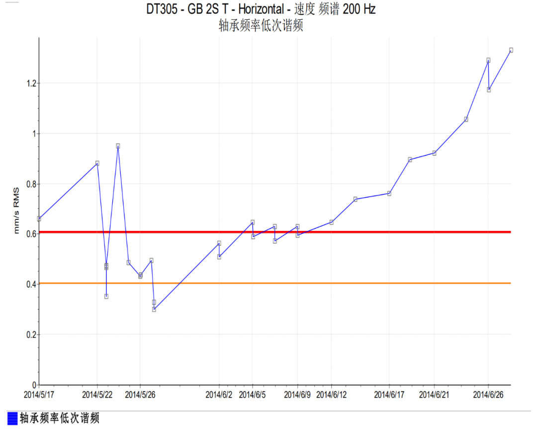 對于低速重載齒輪箱軸承用振動的方法進行監(jiān)測,前中期故障是比較難發(fā)現(xiàn)的,所以我們重點監(jiān)測軸承故障中后期。隨著故障的發(fā)展,到了故障中后期,振動加速度和包絡(luò)解調(diào)對故障特征的指示同樣不明顯,但可以作為趨勢跟蹤進行監(jiān)測。