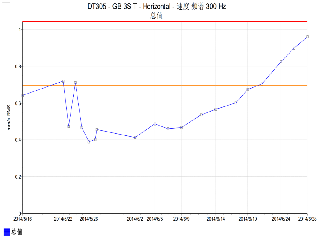 由于生產(chǎn)不允許停機,對齒輪箱進行監(jiān)控運行,通過振動趨勢的監(jiān)測發(fā)現(xiàn),GB 2S T 和 GB 3S T 軸承測點振動值在不斷抬升(見圖 5 和圖 6),說明軸承狀態(tài)在不斷惡化,在做好檢修的充分準備工作后于 2014 年 6 月 28 日按計劃停機檢修。