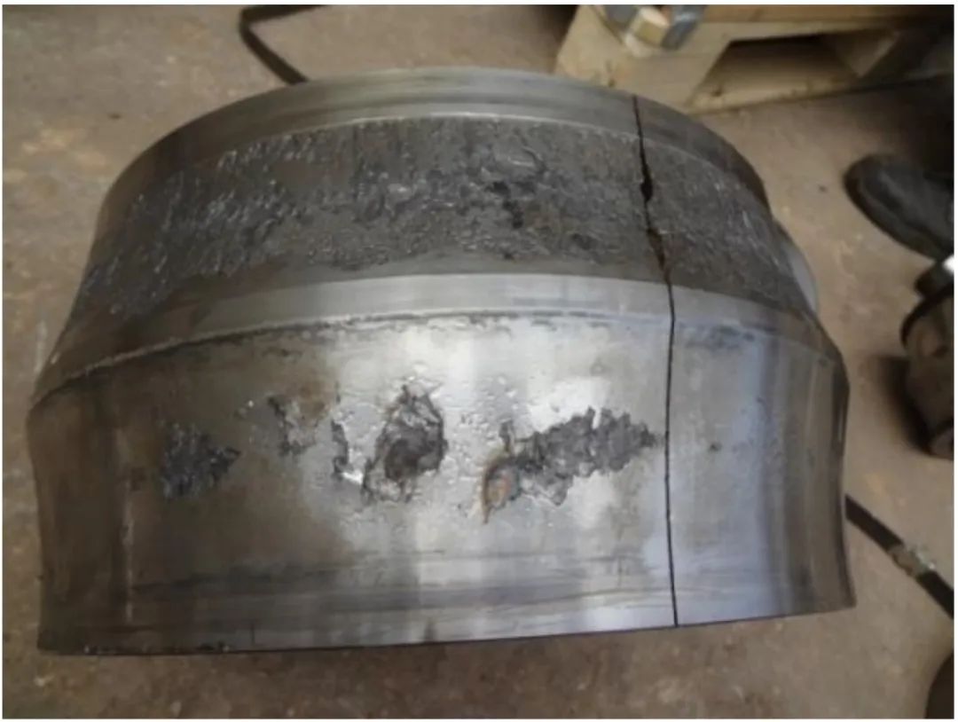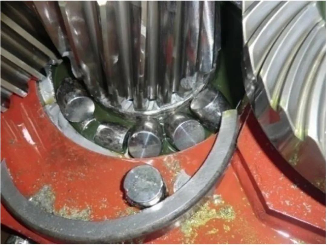 下面介紹另一大豆壓榨廠的脫溶機(DT)減速機軸承故障案例,2013年7月份我們檢測時發(fā)現(xiàn)了 GB-2S 軸軸承(SKF22328CC)出現(xiàn)了內(nèi)圈故障特征頻率成分,并伴隨 GB 2S 軸轉(zhuǎn)頻的邊頻帶(見圖 9),建議停機檢查,但由于一直沒有采取行動,也沒有采取任何加強監(jiān)測的手段,到 9 月份由于軸承嚴重損壞導致齒輪嚴重損傷的二次破壞停車事故(見圖 10),對生產(chǎn)造成了嚴重的影響,對檢修工作非常被動,造成了不小的經(jīng)濟損失。