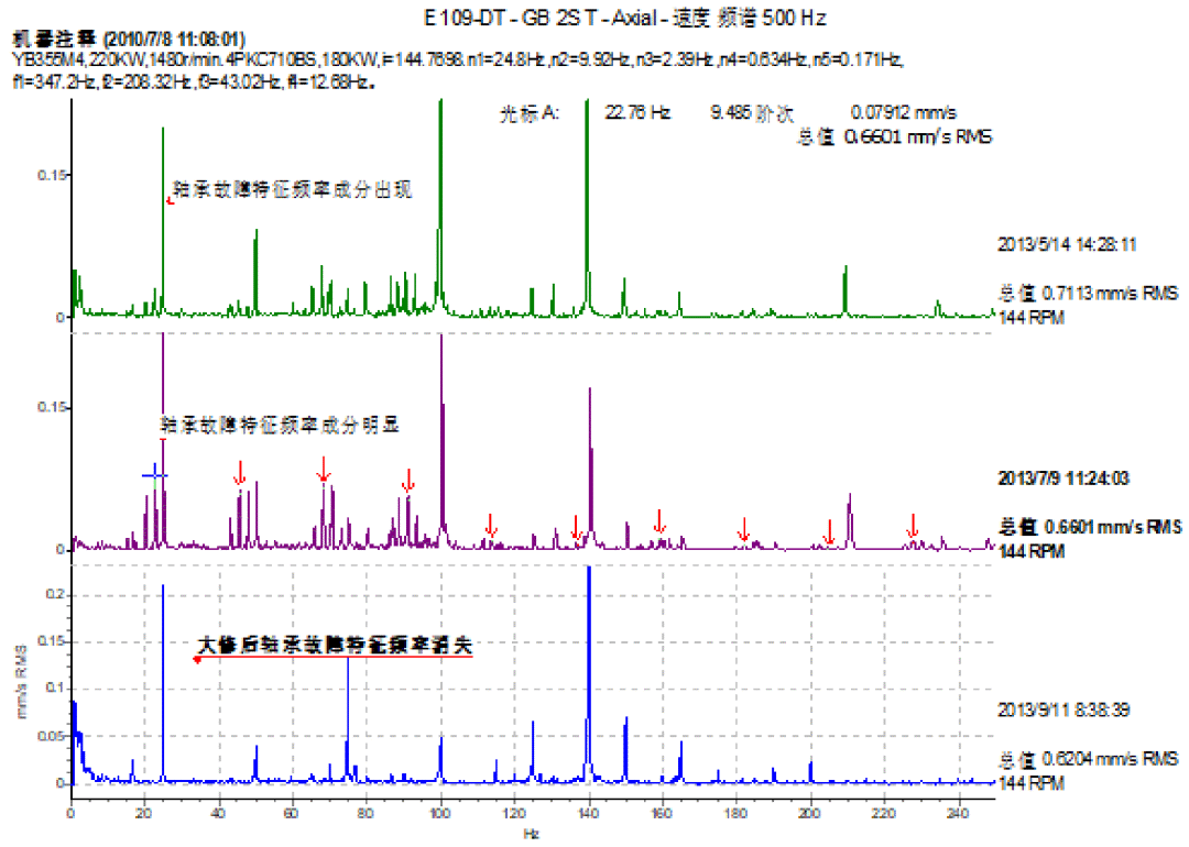 通過對振動頻譜和波形的分析,可以很好地找出故障源所在。對振動趨勢的監(jiān)測,能較好的掌握故障的惡化情況。