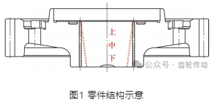變速器7T800機(jī)型是某世界汽車巨頭全球新車型的傳動(dòng)系統(tǒng),其一擋齒輪結(jié)構(gòu)設(shè)計(jì)為內(nèi)花鍵,與中間軸外花鍵通過壓裝相配連接。該零件的內(nèi)花鍵較長,內(nèi)孔壁厚變化較大,熱處理(滲碳淬火)時(shí)內(nèi)孔徑向變形不一致,導(dǎo)致內(nèi)花鍵上中下三段M值不同,呈現(xiàn)軸向錐度,如圖1所示。該熱處理變形導(dǎo)致的不合格率約為10%,對(duì)產(chǎn)品質(zhì)量和交付造成了較大影響。