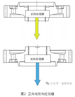 一擋齒輪內(nèi)花鍵是通過拉花鍵方式加工。由于上下兩端結(jié)構(gòu)不對(duì)稱,且內(nèi)孔一端突出輪輻較多,形成凸臺(tái),因此加工內(nèi)花鍵的方式有正向和反向拉花鍵兩種方式,如圖2所示。