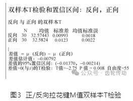 抽取正向和反向拉花鍵的產(chǎn)品各30件,測(cè)量?jī)?nèi)花鍵M值進(jìn)行雙樣本T分析。H0:正向與反向拉花鍵對(duì)M 值沒有顯著差異;H1:正向與反向拉花鍵對(duì)M值有顯著差異。分析結(jié)果如圖3所示,P值<0.05,拒絕H0,正向和反向拉花鍵的一擋內(nèi)花鍵M值存在明顯差異。因此,確定熱前改用反向拉花鍵的工藝。