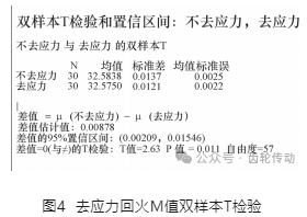 (1)焊接應(yīng)力 該零件為齒輪齒圈焊接結(jié)構(gòu),考慮焊接產(chǎn)生較大的應(yīng)力可能引起內(nèi)花鍵變形大,采用200℃回火2h的方案進(jìn)行驗(yàn)證。取去應(yīng)力回火(200℃×2h)和正常生產(chǎn)的零件各30件,測(cè)量M值進(jìn)行雙樣本T分析。H0:熱處理前回火去應(yīng)力對(duì)M值沒有顯著影響;H1:熱處理前回火去應(yīng)力對(duì)M值有顯著影響。分析結(jié)果如圖4所示,P值<0.05,拒絕H0,去應(yīng)力和不去應(yīng)力的一擋內(nèi)花鍵內(nèi)花鍵M值存在明顯差異。據(jù)此,零件焊接探傷后增加去應(yīng)力回火工序。