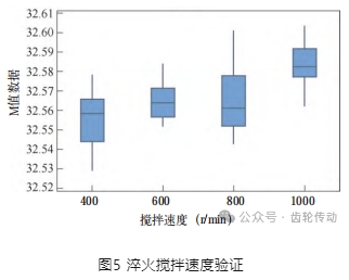 (2)攪拌速度 理論上降低淬火烈度,有利于淬火變形的改善。通過改變淬火攪拌速度,降低淬火油的流量,驗(yàn)證內(nèi)花鍵的熱變形變化。不同攪拌速度的驗(yàn)證結(jié)果如圖5所示,從四種攪拌速度統(tǒng)計(jì)數(shù)據(jù)看,600r/min淬火的M值數(shù)據(jù)均值靠近中差,且標(biāo)準(zhǔn)差最小,數(shù)據(jù)更優(yōu),配合拉刀的調(diào)整可以實(shí)現(xiàn)熱后M值合格。