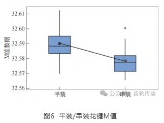 通常而言,串裝吊立方式會(huì)因?yàn)榱慵灾貛砣渥?,?nèi)孔圓度變差,內(nèi)花鍵錐度和周累變大。而平放能使零件徑向冷卻均勻,周累和錐度變形較小。然而該零件的結(jié)構(gòu)特殊,齒輪大而輪輻薄,且內(nèi)孔上下結(jié)構(gòu)不一致,平放時(shí)的變形程度更加嚴(yán)重。因此結(jié)合該零件內(nèi)孔有凸臺(tái),并非對(duì)稱結(jié)構(gòu),做平裝并增加補(bǔ)償套的方式,對(duì)比用補(bǔ)償芯軸串裝吊立的方式來驗(yàn)證能否減少內(nèi)花鍵變形。驗(yàn)證結(jié)果如圖6所示,熱處理平裝和串裝的一擋內(nèi)花鍵M值存在明顯差異,且串裝的均值和標(biāo)準(zhǔn)差好于平裝。