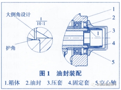 圖1中,壓套3與固定套4為裝配T裝,固定套4頭部設計成合適的錐形,外表面粗糙度與油封檔相同或更低,油封在壓套3上滑動時保護油封唇口,各摩擦面高頻淬火以提高耐磨性;壓套3與油封接觸部分設計成止口,止口直徑比油封外徑略小,止口高度為裝配后油封與箱體的距離。采用大倒角和護角設計,以保護油封主副唇不受損傷。裝配時,先將固定套4裝入空心軸5,并在同定套4外表面涂抹適量潤滑脂;在待裝配油封的主唇口與副唇口形成的空間中涂抹適量潤滑脂,可以對唇口起到潤滑作用;再將油封通過固定套4輕輕地推到箱體孔附近,最后用壓套3將油封裝入。由于壓套3、固定套4和空心軸5有一定的配合關系,所以裝入的油封不會歪斜。而且采用這種丁裝裝配的油封位置一致性非常好。