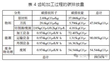 根據齒輪加工過程的碳排放計算模型,將上述數據帶入各項公式,可得該實際加工產生的各環節的碳排放,將個部門進行求和可得該齒輪加工過程中的碳排放總量,具體數據見表 4。