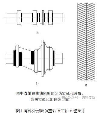 噴槍狀態 - 角度:對于軸類零件圓角,工件水平放置噴槍應成45°垂直圓角噴射。對于齒圈,噴槍成一定角度盡可能垂直齒面進行噴射,以保證彈丸的最大撞擊力,強化方法如圖2所示。