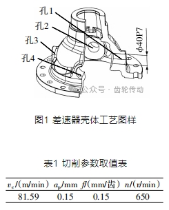 圖 1 所示為差速器殼體的工藝圖樣,車銑復(fù)合中心加工十字孔共3道工序, 分別是粗鏜、半精鏜、鉸孔。鉸削4個(gè)十字軸孔為最后一道工序,其尺寸及精度要求為:十字孔直徑為φ40 mm,公差等級(jí)為P7,表面粗糙度為Rz16 μm,目前使用的切削參數(shù)如表1所示。