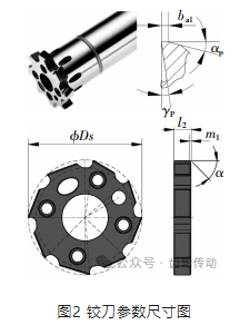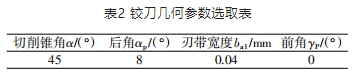 刀具角度的選擇直接影響加工精度及加工的穩(wěn)定性。根據(jù)鉸刀的參數(shù)選取經(jīng)驗(yàn)與新式鉸刀選型表,確定鉸刀的幾何參數(shù),如表2所示。
