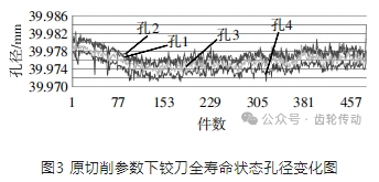 實(shí)驗(yàn)前選取近期加工過(guò)程最穩(wěn)定且刀具使用壽命最長(zhǎng)的227型號(hào)工件,通過(guò)全自動(dòng)在線綜合量?jī)x采集加工孔徑數(shù)據(jù),得到了原有切削參數(shù)下鉸刀全壽命狀態(tài)孔徑變化圖(如圖3),變化圖的初始階段加工尺寸有明顯的擴(kuò)大現(xiàn)象,然后孔徑尺寸逐漸減小趨于平穩(wěn);第二階段刀具處于加工穩(wěn)定期,孔徑尺寸基本介于39.972~39.978 mm的范圍內(nèi);第三階段孔徑逐漸變大最終超差,鉸刀壽命期加工長(zhǎng)度接近500 件,加工總長(zhǎng)度不超過(guò)100 m。分析刀具全壽命周期的變化情況,初始階段一般情況下刀具較為鋒利,刀具直徑接近上差,而后受安裝跳動(dòng)的影響,鉸刀會(huì)向孔心方向磨損并趨于穩(wěn)定,圖3中初始階段曲線下降緩慢,明顯表現(xiàn)出的是刀具安裝跳動(dòng)偏大。第三階段隨著刀具的磨損,刀具的切削刃出現(xiàn)了較嚴(yán)重的局部磨損,所以刀刃的切削點(diǎn)會(huì)向下偏移,或者存在積屑瘤等問(wèn)題,刀具非正常切削,摩擦力增大,使得工件孔徑變大。