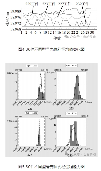 對(duì)30件工件做孔徑數(shù)據(jù)統(tǒng)計(jì),整理出各工件型號(hào)的每個(gè)工件中4個(gè)十字軸孔的平均值曲線,曲線圖展示了不同壁厚的殼體的收縮值有所不同。把不同型號(hào)的30件產(chǎn)品的孔徑數(shù)據(jù)求出4個(gè)平均值后,對(duì) 4 個(gè)平均值再取平均,最終得到孔徑值為39.976 mm。此時(shí),30件產(chǎn)品中孔徑壁厚最薄的229工件加工的上限值為39.984 mm,而孔徑壁厚最厚的232工件加工的下限值為39.966 mm,所以鉸刀直徑尺寸有4~6 μm的空間,如果直徑尺寸直接降低6 μm,也能夠保證孔徑的均值在中差位置,但有可能會(huì)使232工件更接近下差,為保險(xiǎn)起見(jiàn)將鉸刀直徑降低4 μm,由原來(lái)39.978 mm改為39.974 mm。