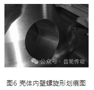 如圖 6所示,在鉸刀磨損較嚴(yán)重的后期階段出現(xiàn)了十字孔由內(nèi)向外劃痕逐漸加深現(xiàn)象,造成孔壁劃痕最直接的原因是積屑瘤問(wèn)題。要抑制積屑瘤形成或者降低其大小主要考慮控制切削速度、降低進(jìn)給量、增大刀具角度及使用潤(rùn)滑性較好的切削液等。在切削用量與刀具使用壽命的關(guān)系表達(dá)式中表明,切削速度對(duì)刀具使用壽命影響最大,進(jìn)給量次之,背吃刀量影響最小。由于實(shí)際加工中,半精鏜工序已經(jīng)確定了鉸刀的加工余量,最快捷的方法是從降低進(jìn)給量的方向考慮。
