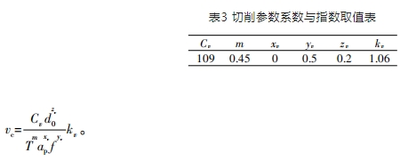 在其他參數(shù)不變的情況下,分若干組進(jìn)行縱向?qū)Ρ仍囼?yàn),每組試驗(yàn)進(jìn)給量在原有參數(shù)的基礎(chǔ)上降低0.01 mm并核算刀具壽命。目前廠家推薦進(jìn)給量為每齒0.15 mm,根據(jù)切削參數(shù),查找《機(jī)械加工工藝師手冊(cè)》,通過(guò)切削速度公式可以反求出相應(yīng)的刀具壽命,表3為相關(guān)系數(shù)與指數(shù)的取值。