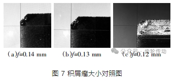 如圖7所示,在進(jìn)行了3次實(shí)驗(yàn)后,即進(jìn)給量為每齒0.12 mm的情況下,劃痕消失,積屑瘤最小,核算刀具壽命期內(nèi)能加工760件,折算成加工長(zhǎng)度接近152 m。