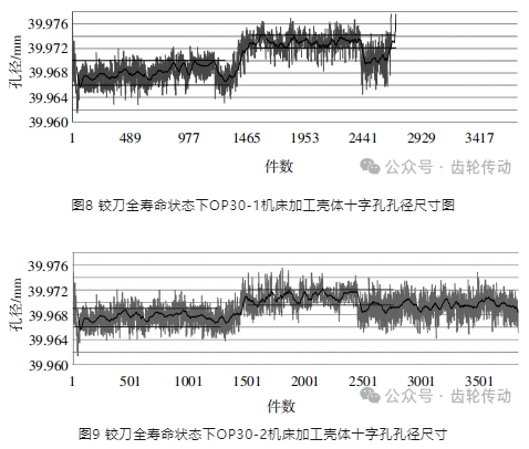 更換試驗(yàn)用刀前,要分別對(duì)兩臺(tái)機(jī)床半精鏜后的孔徑進(jìn)行確認(rèn),并在更換39.974 mm鉸刀后檢驗(yàn)跳動(dòng)值,兩臺(tái)機(jī)床均控制在2 μm以內(nèi)。試驗(yàn)設(shè)置對(duì)照組,選擇殼體壁厚較大的227型和232型產(chǎn)品進(jìn)行試驗(yàn),由于232型產(chǎn)品壁厚最大,先對(duì)其進(jìn)行測(cè)試,使孔徑公差下限得以驗(yàn)證;待加工500件左右更換227型產(chǎn)品。OP30-1機(jī)床保留原有進(jìn)給量(每齒0.15 mm),OP30-2機(jī)床進(jìn)給量改為每齒0.12 mm。切削液濃度值在OP30-1機(jī)床保留當(dāng)前使用范圍(7%~8%),OP30-2機(jī)床提高推薦濃度最大值為10%。調(diào)試完成后,正常進(jìn)行每日的加工任務(wù),跟蹤連續(xù)生產(chǎn)。