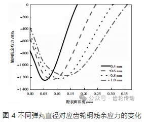 從圖 4 中可以看出,隨著彈丸直徑從 0.4 mm 增大至 1.0 mm,對(duì)應(yīng)所冶煉形成齒輪鋼的表面殘余應(yīng)力從 756 MPa 下降至 378 MPa,降幅達(dá) 50%;次表面的最大殘余應(yīng)力從 1 263 MPa(距表面深度 0.06 mm)降低至 1 171 MPa(距表面深度 0.14 mm),降幅為 7%;殘余壓應(yīng)力層和最大殘余應(yīng)力的深度分別由 0.17 mm 和 0.06 mm 增加至 0.35 mm 和 0.14 mm。