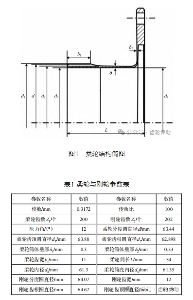 本文以某禮帽形諧波減速器為主要分析對象。禮帽形柔輪在負(fù)載增加的情況下所受應(yīng)力的增幅遠(yuǎn)遠(yuǎn)低于杯形柔輪的增幅,因此比較適合大負(fù)載傳動,柔輪與剛輪的齒廓采用雙圓弧形式,凸輪為標(biāo)準(zhǔn)橢圓且近似為剛體。根據(jù)減速器負(fù)載和安裝要求,給出柔輪的結(jié)構(gòu)簡圖如圖1所示,柔輪與鋼輪的基本參數(shù)取值見表1。